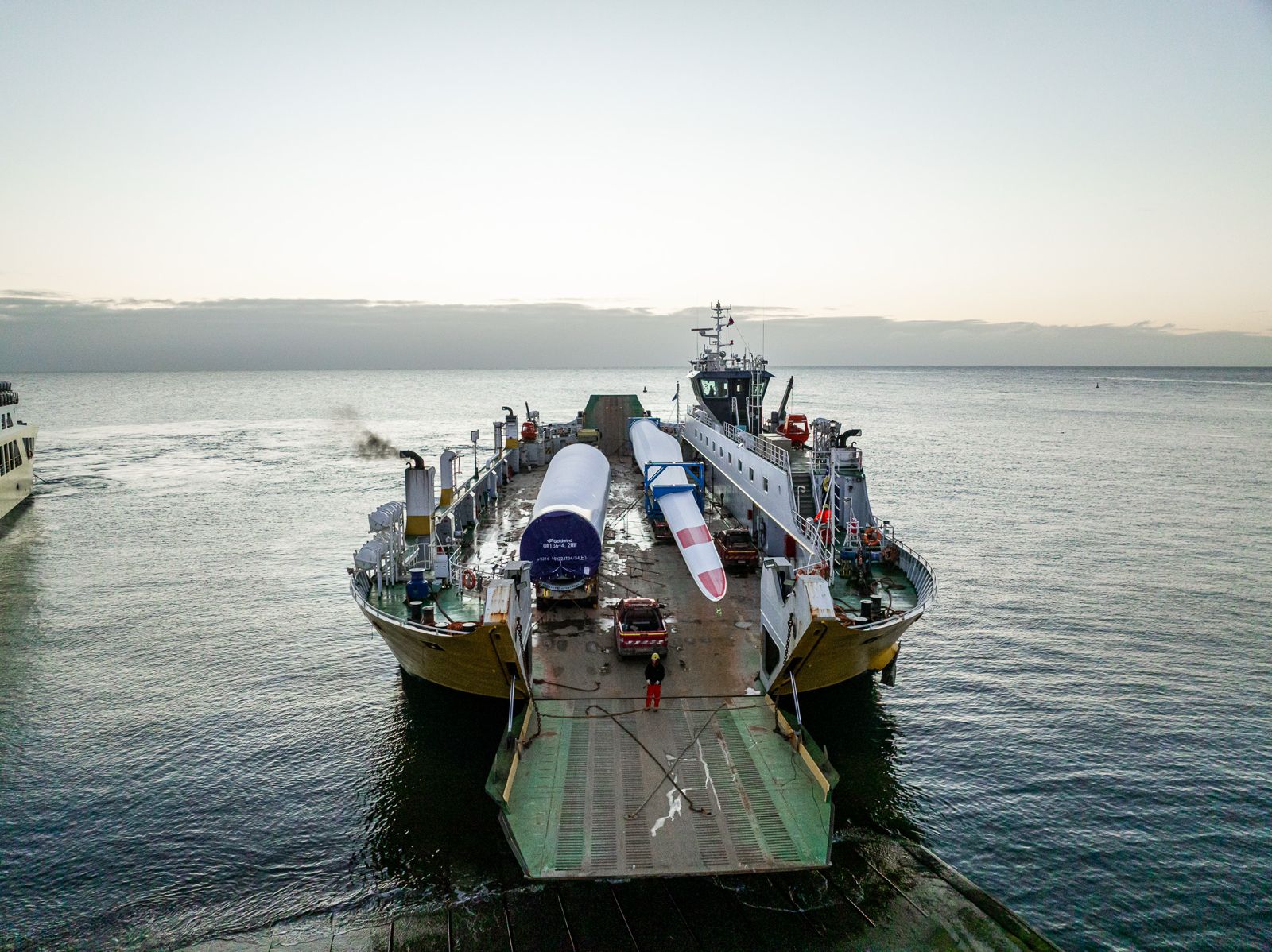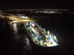La última hélice, una sección de torre y piezas de base de las torres fueron los componentes que la noche del sábado salieron del Terminal José de los Santos Mardones –donde estaban acopiados todos los equipos desde su descarga a mediados de junio- hasta la Rampa de Tres Puentes, ambos recintos ubicados en el sector norte de Punta Arenas y administrados por la Empresa Portuaria Austral, desde donde ingresaron al ferry Kénos (TABSA) para su movimiento marítimo a Primera Angostura ocurrido durante las primeras horas del domingo.