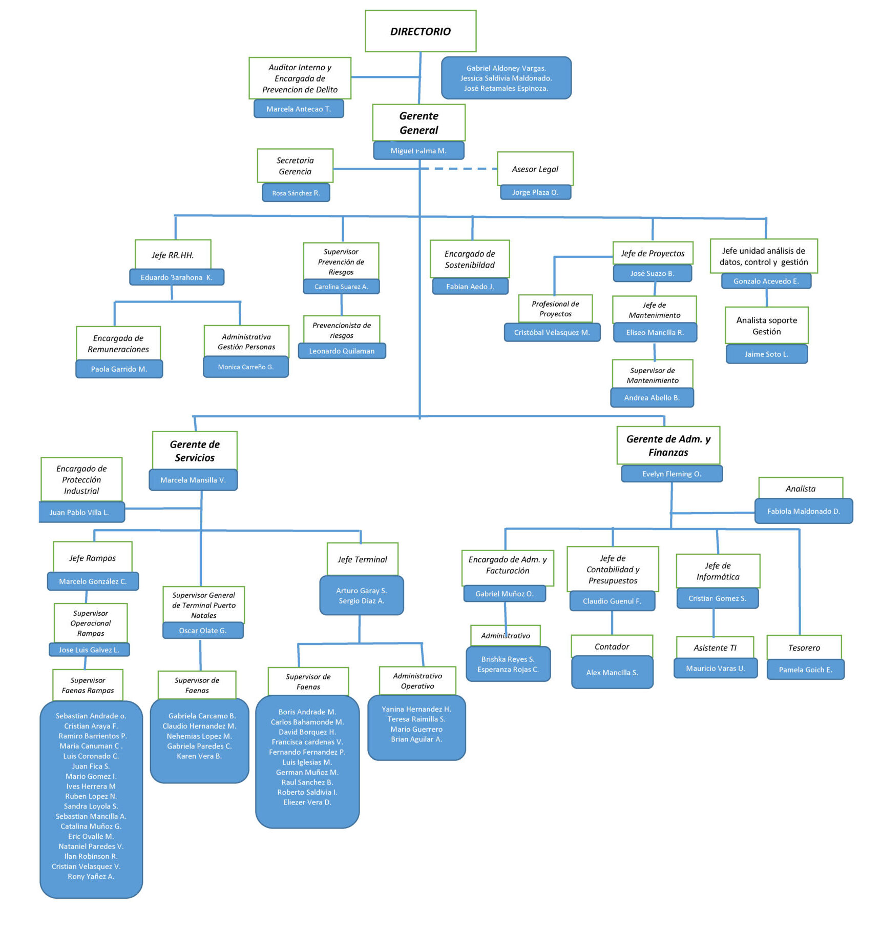 | Administrativos Operativos Terminales | Yanina Hernández Hernández Teresa Raimilla Sepúlveda Mario Guerrero Bustamante Brian Aguilar Aguilar | Funciones del cargo: 1.- Responsables de ejecutar todos los procesos administrativos y operativos relacionados con la liquidación de servicios portuarios, depósitos de carga, el ingreso de información e informes solicitados por los diversos organismos fiscalizadores. 2.- Realizar Apoyo a las funciones de supervisión, control y coordinación de faenas en los recintos portuarios | ||